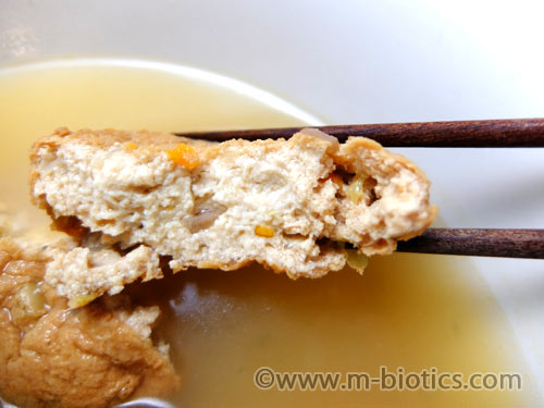 ↑がんもどき。これは、かなり水分が抜けた感じでモソモソしていましたが、水気を少なくするのは長期保存を可能にするために仕方ないのかなと思いました。味は良いです!