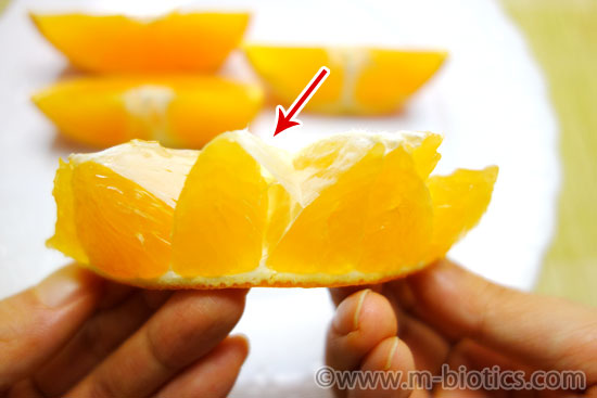↑まずこの、房を包む皮(内皮)がすごく薄いんですよね。果肉のツブツブ感もほとんどなくて、総合的にとても滑らかな感じ。